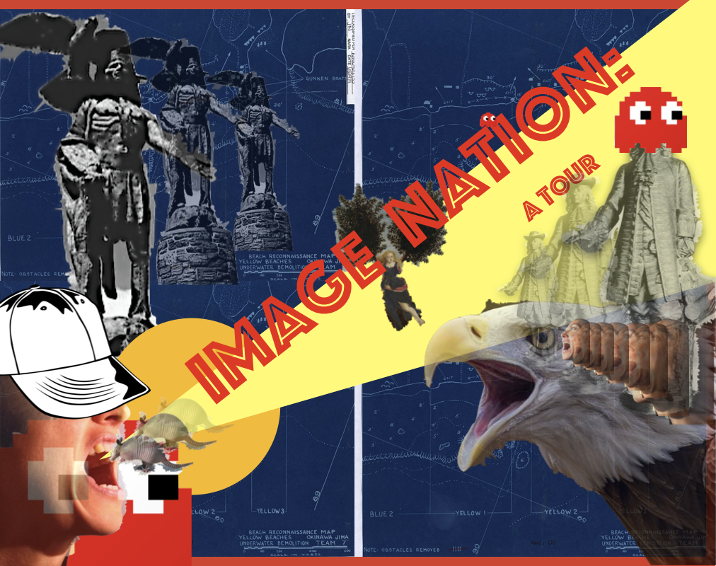 Image Nation: A Tour features a former tour guide stuck in an installation from 1982, or 1892, or...? Linear time warps. Shards of a monument scatter, revealing soup cans, a canister of Quaker Oats, a replica of Penn's Treaty in an 8-bit video game console. Dads pose with pens everywhere. An armadillo says, "Welcome to Welcome Park, installed inside you since 1982, or 1892, or...?" and scurries down a rabbit hole. The guide trips, and follows. We will not walk anywhere but in circles.